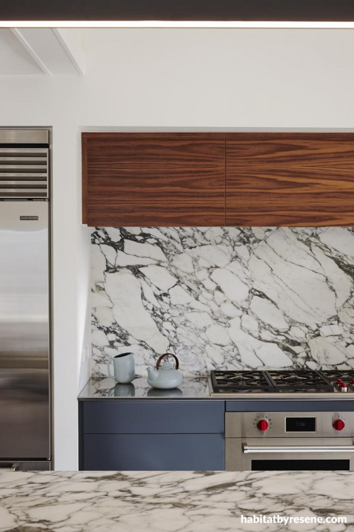 Resene Tuna in the kitchen on cabinetry. “Undertones of blue worked really well with the marble veining.” Resene Quarter Rice Cake on the ceiling and the walls above.