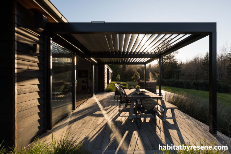 The outside dining area is one of the family’s favourite places to have meals. The exterior of their home is cedar cladding in Wood-X Foundry, available from Resene ColorShops, and the joinery is in COLORSTEEL® Slate.