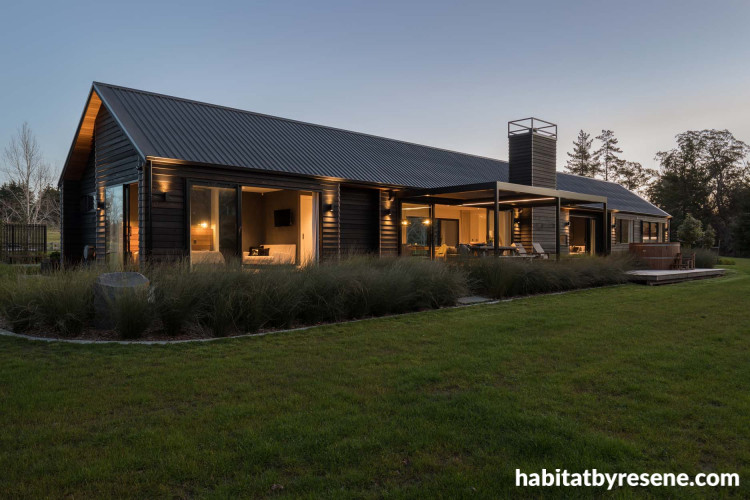 The elegant farmhouse exterior features cedar cladding stained with Wood-X Foundry, available from Resene ColorShops, and COLORSTEEL® Slate joinery and roof.