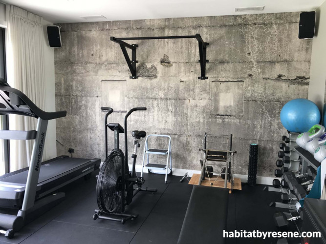 The couple decorated their favourite room in the house, the gym, with a feature wall in Resene Wallpaper Collection 445503, a weathered concrete mural. “We all use this most days and it’s been absolutely fantastic,” says Melissa. “It’s built fit for purpose for what we wanted in a gym, including large bi-folds out to the deck for indoor/outdoor flow.