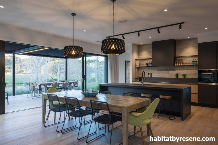 The kitchen and dining room have a beautiful indoor/outdoor flow and walls in Resene Double Sea Fog make the interiors shine. The ceiling and trim are in Resene Triple Alabaster.