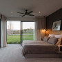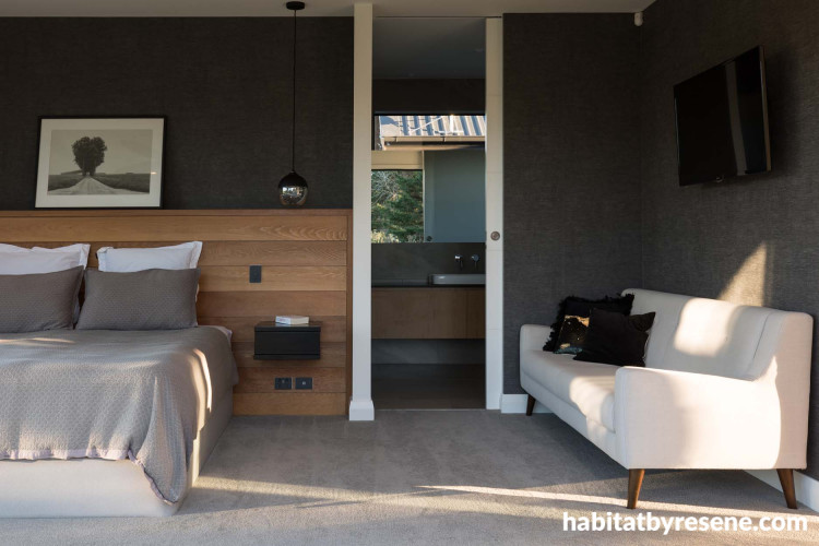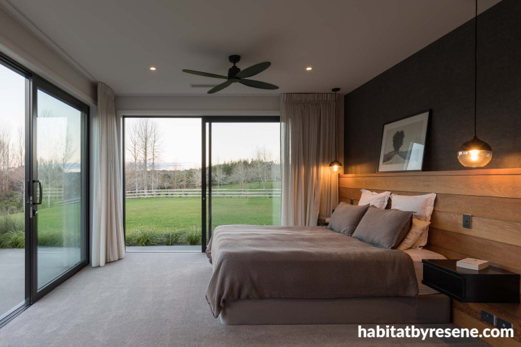 The master bedroom has stunning vistas over the family’s five acres of land. The feature wall is Resene Wallpaper Collection 219428 and the ceiling and trim are in Resene Triple Alabaster.