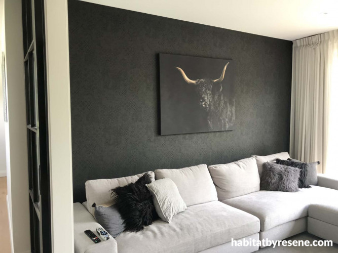 The feature wall in the media room creates intricate detail and a striking mood with Resene Wallpaper Collection 200263. The ceiling is in Resene Triple Alabaster.