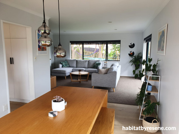 Scott and Angela’s modern neutral colour scheme extends from the kitchen into the living and dining room. Walls in Resene Eighth Surrender are complemented by a ceiling and trims in Resene Alabaster. The three metallic pendants lights reflect the cool grey tones in the wall colours and on the soft furnishings.