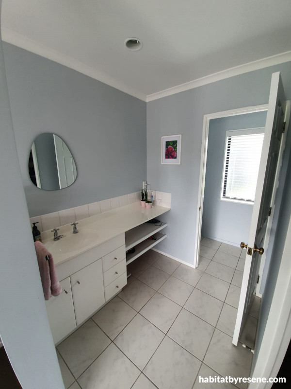 Tackling the renovation of their master bedroom and ensuite over Level 4 lockdown while shops were closed might have been too big a challenge for some, but enterprising Scott took it all in his stride. He self-mixed his own custom shade using Resene Eighth Surrender, Resene Mako and Resene Alabaster to apply to the walls of both areas alongside ceilings and trim in Resene Alabaster. The result is a soft and whispery blue grey that bathes the room in tranquillity. Scott has cheekily named his creation ‘Covid Blue’. If you’d prefer to leave the mixing to the professionals, try Resene Gull Grey, Resene Zumthor, Resene Quarter Powder Blue or Resene Mystic to get a similar look.