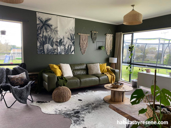 The living room has become a family favourite painted in Resene Kelp. Jinel spied the shade on the Resene Facebook page. “I saw it, loved it and had to use it; the room has such a cosy feel now with the dark walls. It’s where most of my plant collection lives too.” Macrame wall hangings in subtle cream and beiges stand out against the colour.