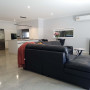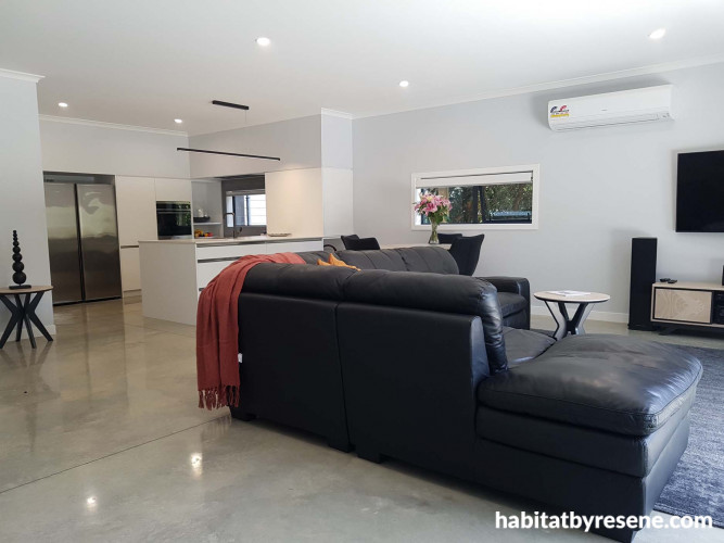 The lounge and kitchen flow seamlessly with pale grey Resene Half Iron on the walls and trim in Resene Quarter Black White.