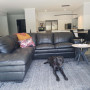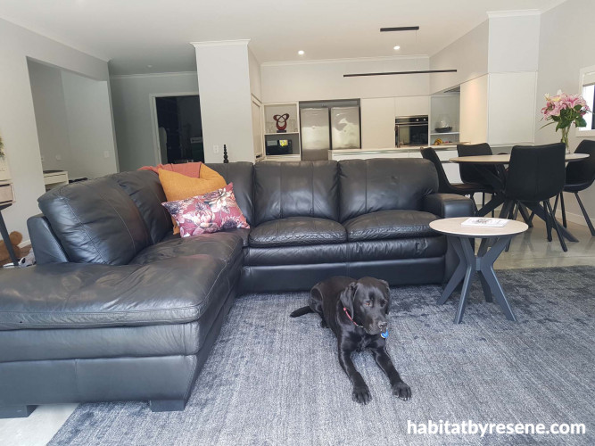 Marie and her mobility dog Konrad are enjoying life in their minimalistic home. The walls of the kitchen and lounge are in Resene Half Iron with Resene Quarter Black White trim.