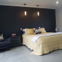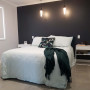 The second bedroom is striking with Resene Foundry on the feature wall, Resene Half Iron on the surrounding walls and trim in Resene Quarter Black White.