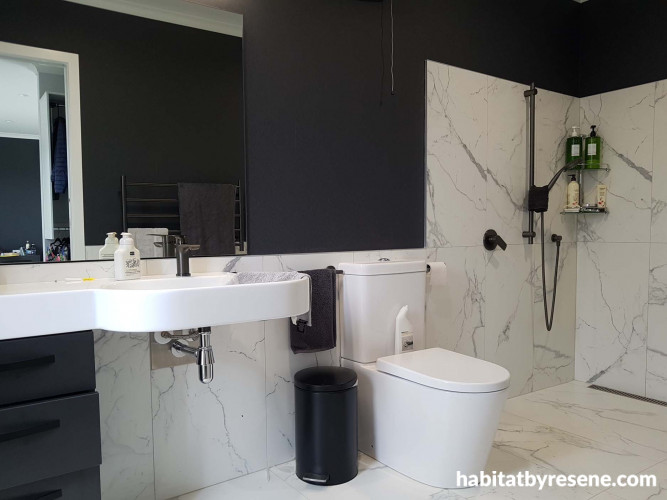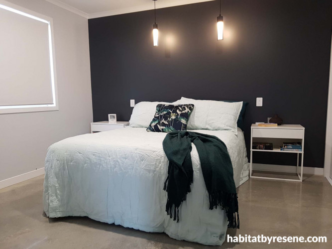 In the bedrooms, Marie created striking a feature wall in Resene Foundry in the spare room and dark wallpaper similar to Resene Foundry in the master created another bold feature. Resene Foundry is a shadowy charcoal with a hint of warmth. She continued the colour palette through the bedrooms and into the main bathroom, where wall in Resene Half Foundry contrasted beautifully with the tiling. “I love everything about the choices I made,” says Marie. “If I had to pick, my favourite room would be the master bedroom.