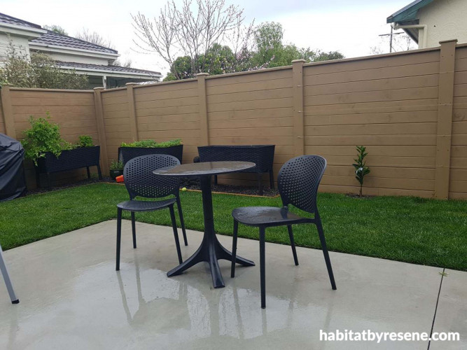 The boundary fence stained in Resene Driftwood creates a warm atmosphere in Marie’s back garden.