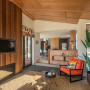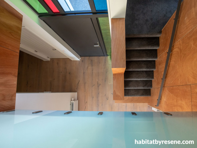 The open plan living space with clearly defined areas makes it adaptable for larger family gatherings. The statement Gaboon plywood ceilings and stairwell walls are finished in Resene Aquaclear Satin. The plywood features link parts of the downstairs area together and connect to the central cedar feature wall.