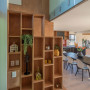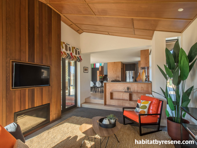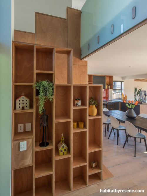 Wooden shelves add interest to the living spaces and are also a great storage solution. The plywood is finished with Resene Aquaclear Satin.
