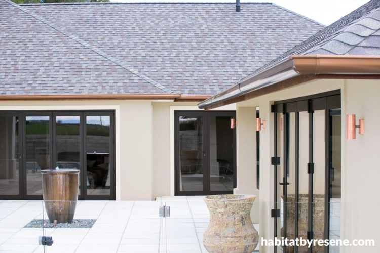 Stylish copper feature lighting also adorns this exterior, making a statement against Resene Double Merino. Marley Typhoon® spouting and RP80® downpipes in Copper continues the on-trend copper features of the home.