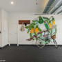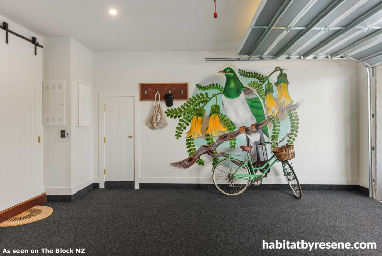 Resene Barely There on the walls inside Connie & Rach’s garage provide the perfect canvas for their colourful mural.