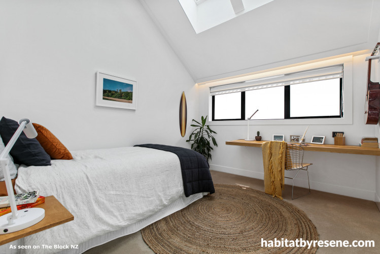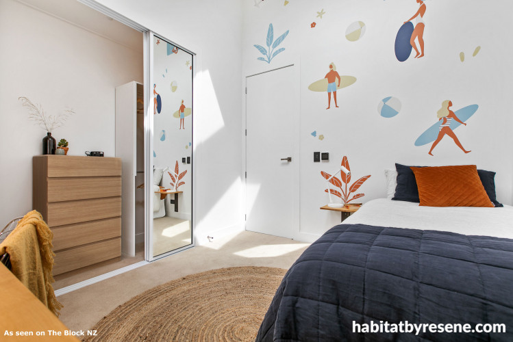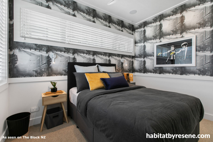 Their risky move paid off – scoring them a whopping 17.5/20. Tim & Arthur’s kid’s bedroom reflects their collective passion for surfing and music, with surf-themed vinyl stickers applied to the Resene Black White wall and a guitar cleverly hung on the wall opposite. The Resene Black White continued from wall to ceiling, creating a light-filled room leaving the space feeling bright and spacious. Judge Ann-Louise loved the beachy theme paired with the natural textures and stylised decals, scoring the room 9/10. Judge Lauren said the space was sophisticated and comfortable, with a fabulous colour palette. “It’s a 100 per cent improvement on where they were last week,” says Lauren. “I think buyers will love this room. It’s light, it’s bright, it’s simple and not cluttered. They’ve thought of all the aspects that need to be thought of with a teenager.”