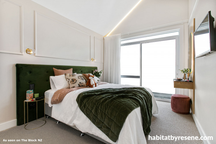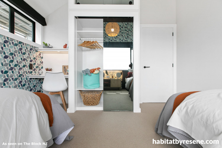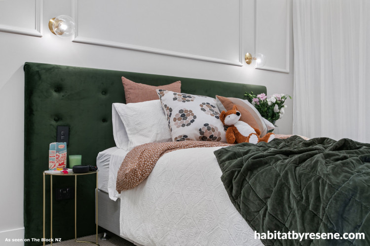 With first pick of the houses and after much deliberation, the Papamoa ‘fun mums’ Janah & Rach chose to move into House 1. With architectural ceilings and killer views, the team created a kid’s bedroom worthy of the home’s elegant spaces. Styled for a teenage girl, Janah & Rach’s glamorous bedroom featured a bespoke makeup table and a green velvet headboard created by their husbands. After a few brief hiccups; painting the skirting boards the wrong colour and axing their original panelled wallpaper idea, the team were soon back on track to deliver a stylish finished product. “We love our room and we think we’ve raised the bar on last week,” says Rach.
