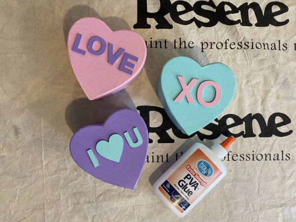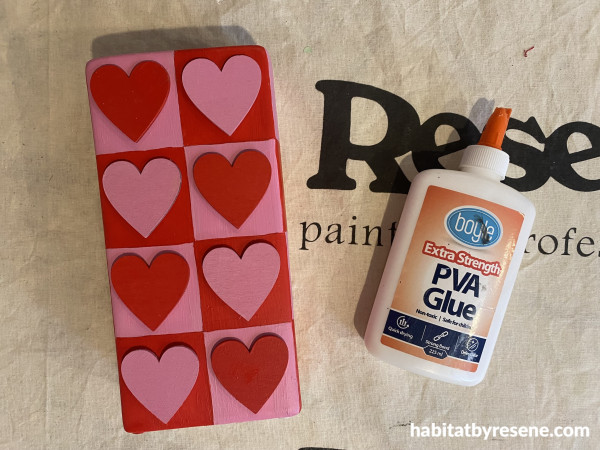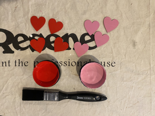 Step 4: Paint the wooden love hearts in Resene Poppy and Hopbush.