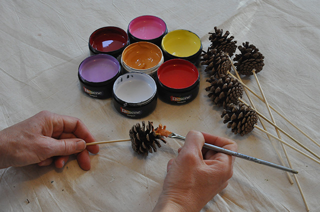 Step 3 Once the glue is dry, use a small craft paintbrush to paint each of the pinecones a different colour. Fleur used Resene Jalapeno, Resene Boogie Wonderland, Resene Salsa, Resene Weathered Orange, Resene Festival, Resene Smitten and Resene Alaska.