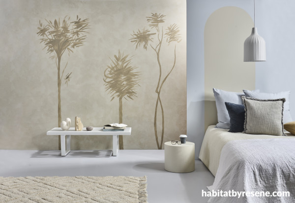 Soothing blues and neutrals collide in this bedroom. The back wall is painted with a basecoat of Resene Half Caraway top coated in Resene Half Nomad mixed with Resene FX Paint Effects Medium, trees painted in Resene Craigieburn, right wall in Resene Breathless with curved arch in Resene Half Caraway, floor in Resene French Grey, bench and light in Resene Half Breathless and small table painted in Resene Half Caraway. Rug from H&M Home. Project by Kate Alexander, image by Bryce Carleton.