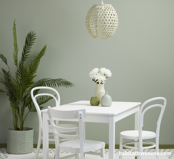 The ultimate shade of solace, Resene Peace, graces these dining room walls and the plant basket. The floor painted in Resene Elderflower with a pattern in Resene Peace, dining table and chairs in Resene Elderflower and vases in Resene New Leaf and Resene Smoothie. Dish from Kmart, napkins from Città. Project by Melle van Sambeek and image by Bryce Carleton.
