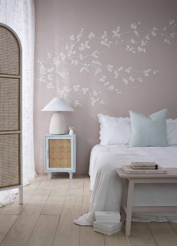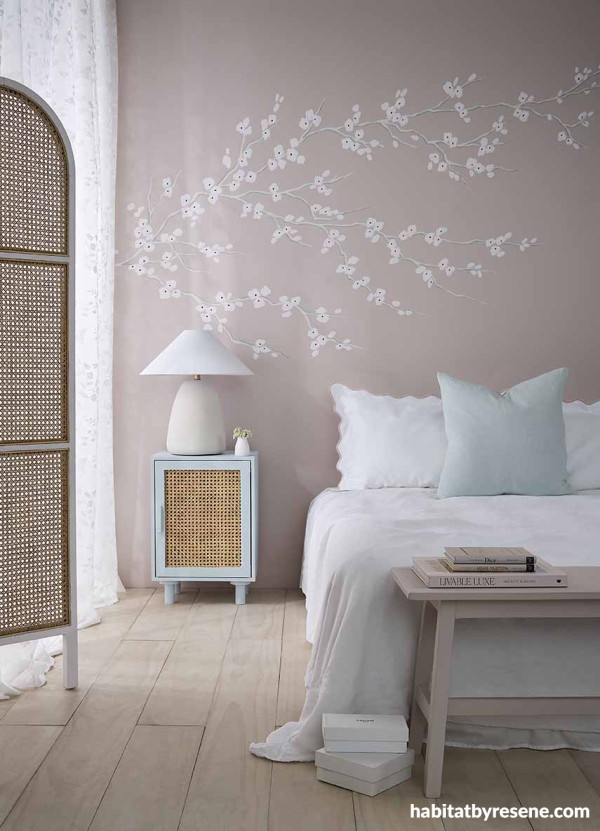 The peaceful pink of Resene Soothe on these walls makes this an inviting and serene place to rest. The hand painted cherry blossom mural is in Resene Sauvignon, Resene Vanquish and Resene Haven, vase and screen frame in Resene Sauvignon, bench seat in Resene Soothe and bedside cabinet in Resene Half Halcyon. Bedlinen from Father Rabbit, cushion from Baya, lamp from Soren Liv. Mural by Hannah Tapner, project by Melle van Sambeek, image by Bryce Carleton.
