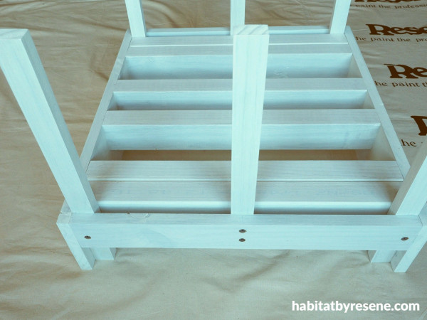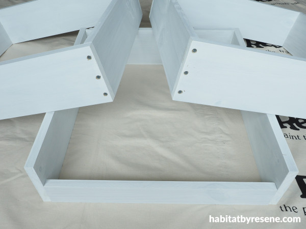 Step 3: Slide the remaining two boxes on top and screw them to the vertical supports, leaving a gap between for rain and air to move in and out. Fill the holes with hole filler, and once dry, sand these smooth and wipe away any dust. Prime with more Resene Quick Dry and then apply two coats of Resene Bitter.