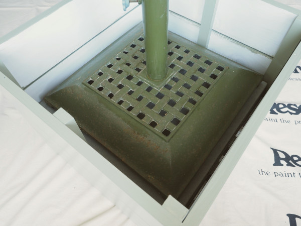 Step 5: Flip the box back over and put in the two large concrete pavers and then the umbrella stand.