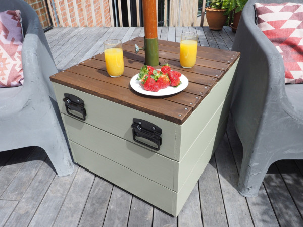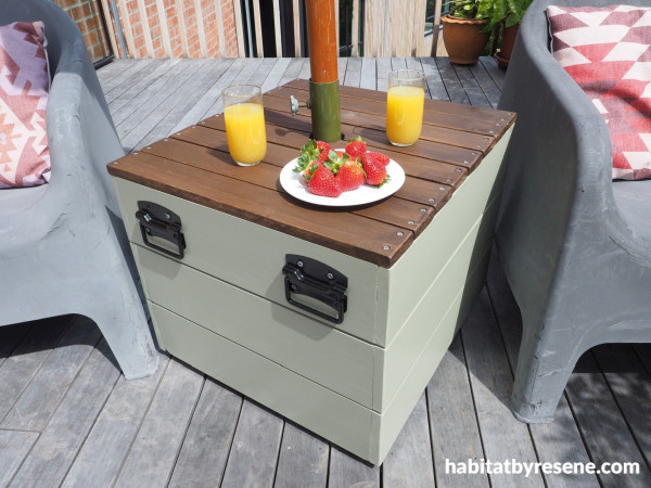 Make the base of your umbrella stand unique, while also doubling as a table for snacks and drinks. Most umbrella stands are just a boring concrete base, but this one is both stylish and practical. We painted ours in the serene green of Resene Bitter.