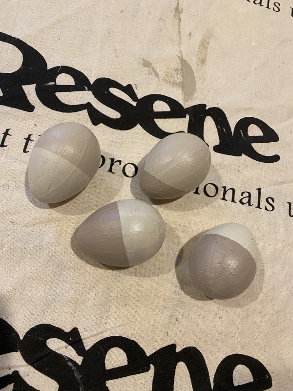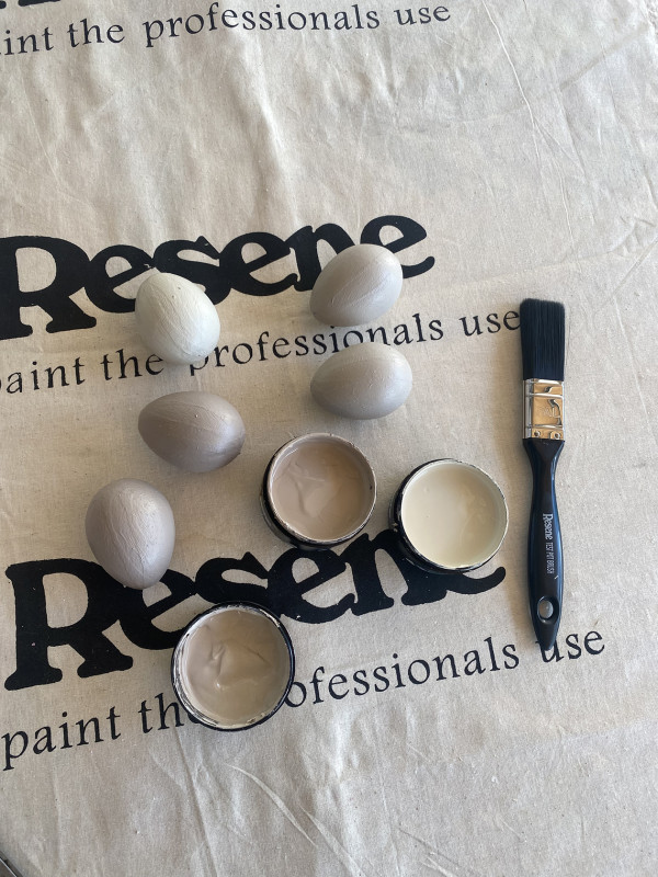 Step 1: Paint your eggs in your chosen colours. We used Resene Joss, Almond Frost and Sugar Loaf.