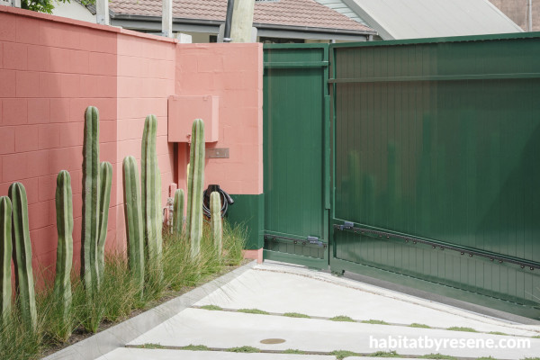 This exterior is an instant pick-me-up. The warm, fruity terracotta of Resene Japonica behind the cactus garden gives this outdoor space a vibrant urban desert feel while the gate painted in Zuccini adds depth to the space. Project by Lymesmith, image by Clinton Weaver.