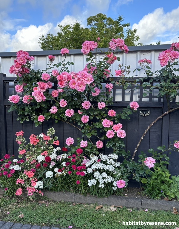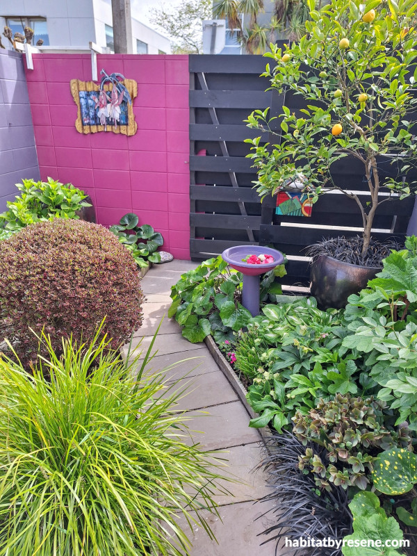 When Maureen was living in rented accommodation following the Christchurch earthquake she had four years to dream about how she would liven up the “boring grey concrete courtyard” of her rebuilt townhouse. She went with walls and garden features in Resene Cardinal with a wooden fence stained in deep charcoal Resene Woodsman Crowshead. “Pink, to match my couch! I also got my glass kitchen backsplash in the same pink to balance the room. The kitchen people rang twice to check that I had actually chosen that colour.”