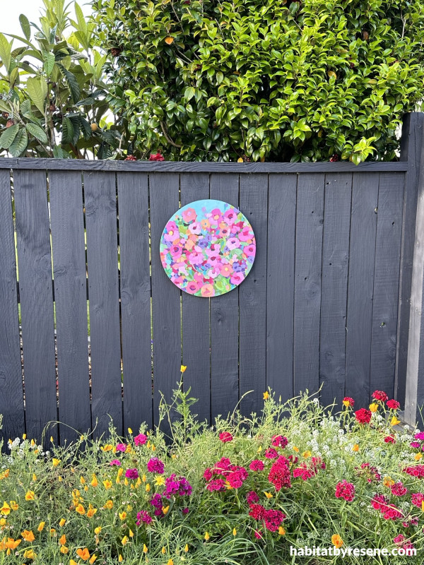 Consider adding colour to your outdoor space that’s inspired by what’s already there – nature’s vibrant hues and your blooming summer florals. Artist and homeowner Nicola chose Resene Bastille for her fence for it’s a beautiful inky, purplish charcoal colour that was also a great backdrop for all her flowers. She then used a vibrant collection of Resene testpots to create her own floral artwork reflecting the beautiful colours of her real life flowers. The colours include Resene Broom, Lip Service, Colour Me Pink, Splish Splash and Poured Milk.