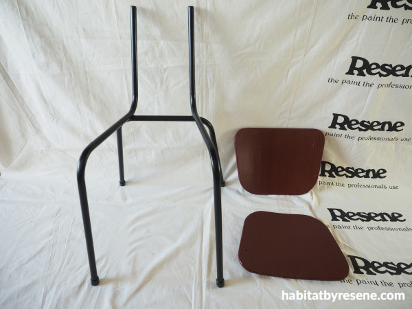 Step 1: Start by unscrewing the wooden seat and backrest from the metal frame. Use a medium grit sandpaper (220 grit is ideal) to sand the frame and the wooden seat and backrest. Wipe away and dust and paint all three pieces with one coat of Resene Quick Dry.