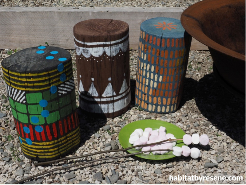 Transform an old log or an offcut from a wooden post into a colourful seat, perfect for perching on beside the garden or fire pit.