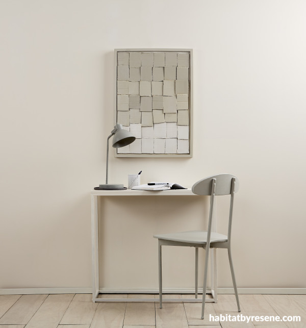 Above: Wall art in Resene Napa, Half Napa and Eighth Napa, wall and desk in Quarter Biscotti, lamp in Half Stonewall, penholder in Eighth Napa and chair in Eighth Stonewall.
