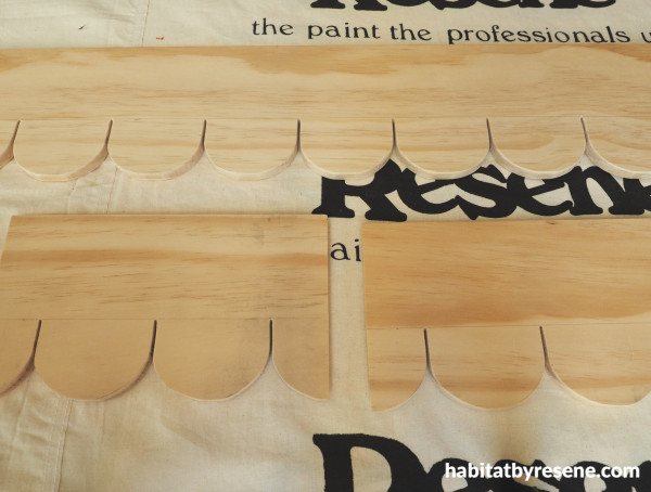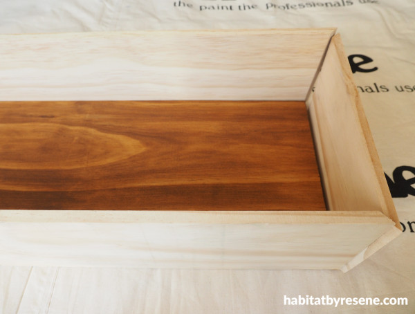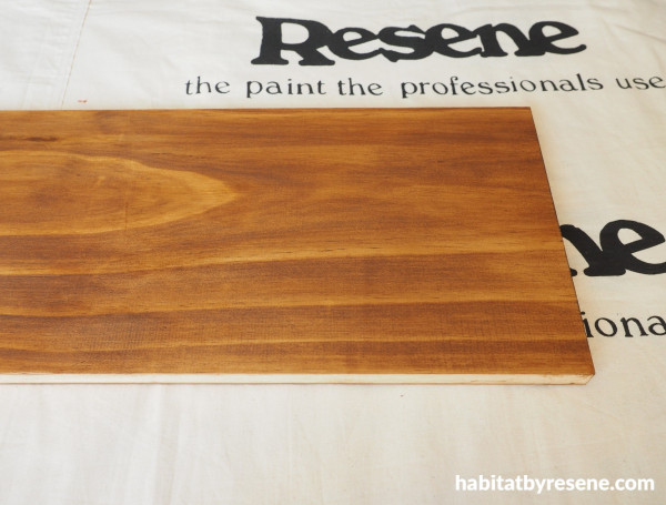 Step 1: Start by cutting the main board to width and length (mine is 22cm wide and 117cm long). Sand any rough edges smooth, and then stain the board with two coats of Resene Colorwood Walnut.