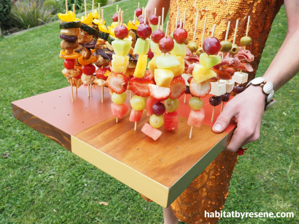 Level up your next outdoor party with this kebab serving block. Serve four (or more) different types of your favourite food on a stick in an easy-to-grab format that will quickly become a crowd pleaser. Quick and easy to put together, and sure to be a stunner thanks to the variety of Resene test pots available, this DIY project will kick off your summer of entertaining.