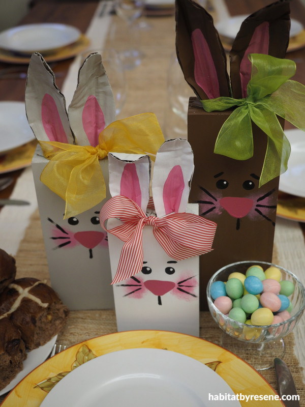 Create a fun family of Easter bunnies to brighten your table this Easter. These cute critters use blocks of wood and reused cardboard to enrich your dining experience. They also make cute homemade gifts for guests who aren’t fans of chocolate.