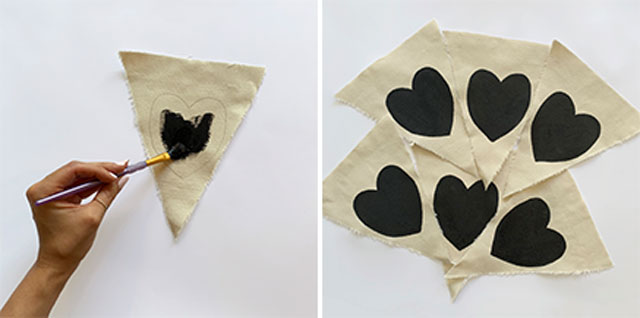 Step 3 Fill in each of the heart shapes with Resene Noir. It doesn’t need to be perfect, but using the small flat artist’s brush will help you get a cleaner edge. Let the paint dry completely. You can use a hairdryer to speed up the drying process.