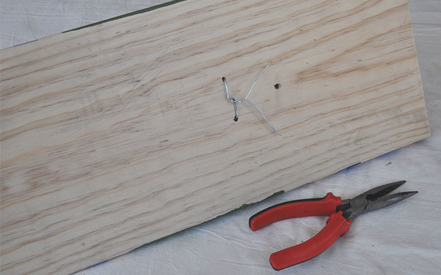 Step 2: Place a pot near the bottom of one of the divisions and measure and mark with a pencil where the wire will go through the board to hold the pot in place. These holes will sit behind the pot just under the lip. Use an electric drill to make two holes about 5cm apart; drill them on an angle so it’s easier to thread in the wire later. If you are going to hang your finished board up with a nail, drill a hole for that. Repeat this down the length of the board for each of the five sections. The holes may need a light sand with medium grit sandpaper.