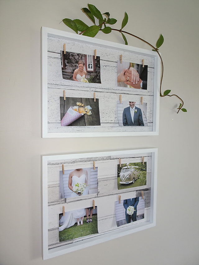 Once the pegs have all dried, reassemble your frames and pop your favourite photos into the pegs. Sarah has used wedding photos taken by Poppymoss Photography, but the great thing about these photo boards is by simply changing out the photos you can have a totally new theme every time.