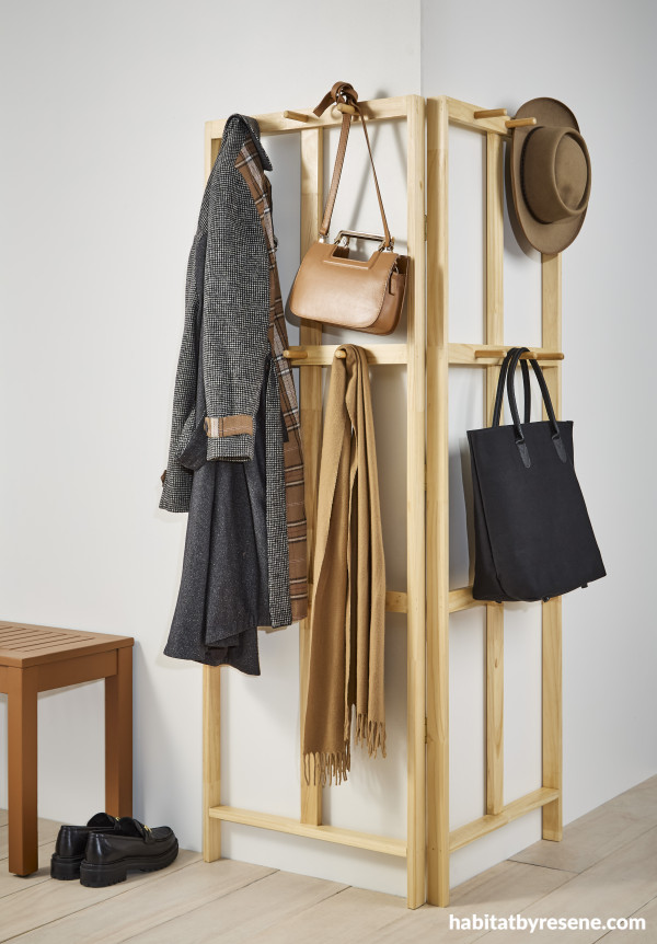 Organise your coats, hats, bags and more with this handy corner clothes rack. Perfect for smaller spaces where all you need is a quaint little corner. We made ours from pine and coated it in Resene Aquaclear satin to leave the natural wood grain showing. Make your own clothes rack with our step-by-step guide here!