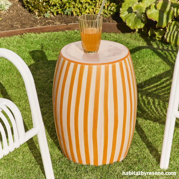 Inject colour and personality into your space with the Stripe Stool from Early Settler in orange and pink. Made from durable ceramic with a high gloss finish, this vibrant piece features hand-painted vertical stripes in playful, summery hues. Perfect for patios, living rooms or garden corners, it captures the essence of relaxed summer living with a fun and functional twist. Pair your Stripe Stool with accessories or furniture in Resene Rice Cake, Ebb, Karry and Touche:
