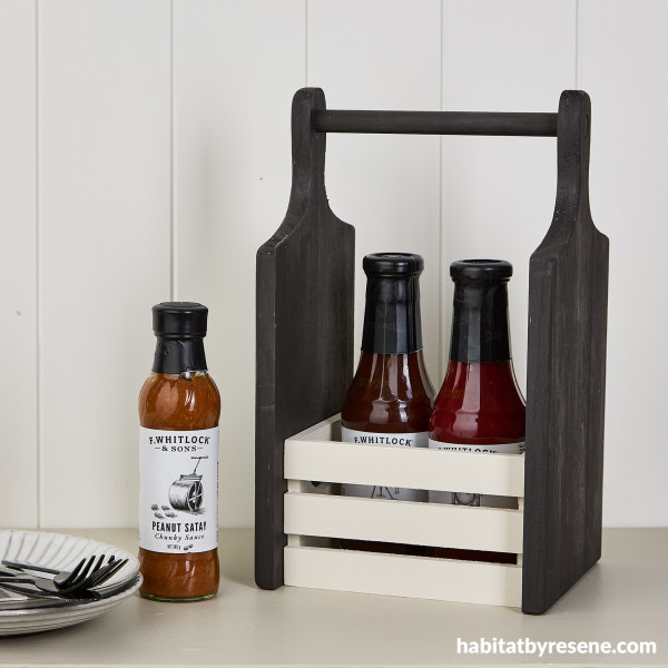 This do-in-a-day DIY condiment holder is a must have for any household. Not only is it great for carrying your sauces outside in BBQ season, but it can also work for carrying drinks outside, or as a small handmade giftbox to pack full of goodies for a loved one. We painted ours in a monochrome scheme, but you could go as colourful as you want with your favourite Resene testpots and even add patterns if you like!