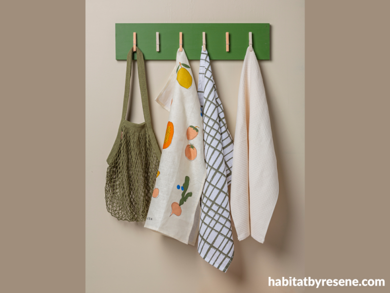 Having a place to hang up your tea towels or market bags will never go amiss in your home. This very simple DIY peg holder is super quick to make and will help those tea towels dry quickly – you could also use this in children’s rooms for their artwork or for hanging items in your laundry. We painted ours green to make the most of Resene’s Paint It Green campaign, but you can use any of your favourite Resene colours.