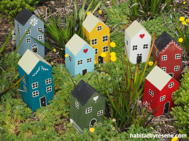 Step 4: Finish the houses with any further cutesy embellishments that you like, such as hearts on the gable ends, picket fences and flowers. Place them in your garden or on a shelf indoors and enjoy.