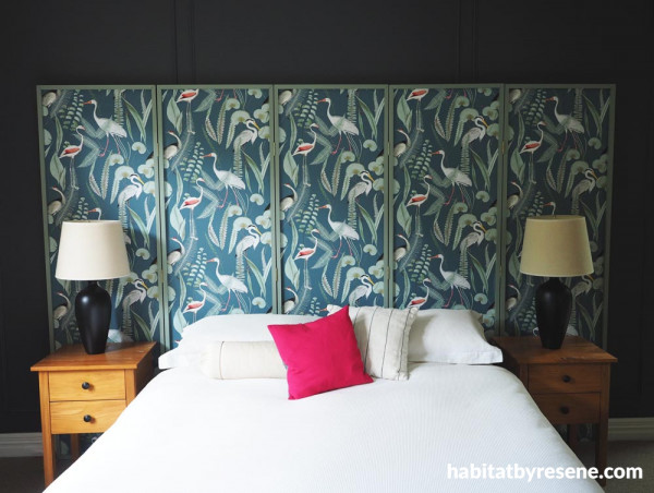 This headboard makes a striking room feature finished in elegant Resene Wallpaper Collection M37414. Wall in Resene Tuna and skirting in Resene Half Rice Cake.