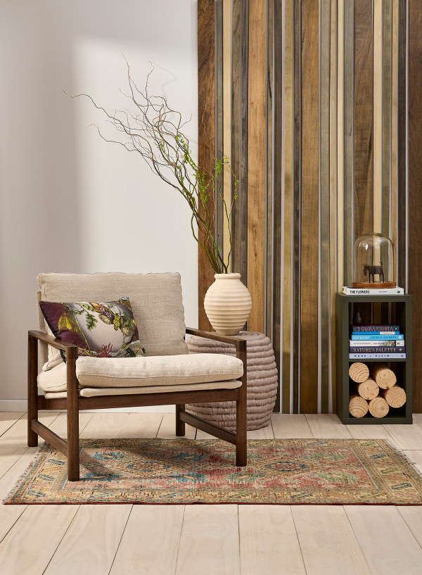 Wood strips in Resene Woodsman Natural Wood Oil, tinted to Resene Tararua, Resene Kahurangi, Resene Paparoa, Resene Fiordland, Resene Mt Richmond and Resene Aotea make up a unique feature wall. Floor stain washed in Resene Colorwood Breathe Easy. Wall painted in Resene SpaceCote Low Sheen in Resene Westar with trim in Resene Eighth Rice Cake, rattan side table in Resene Otter, shelf unit in Resene El Paso, large vase in Resene Sour Dough and small vase in Resene Cape Cod. Chair from Dawson & Co. Project by Katrina Hobbs, image by Bryce Carleton.