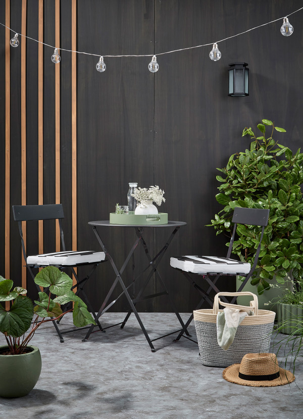 Porch rear wall stained in Resene Waterborne Woodsman Crowshead, with battens in Resene Waterborne Woodsman Pickled Bean. Tray and planters painted in Resene Paddock, table and chairs in Resene Element, pot in Resene Quarter Merino, floor painted in Resene Walk-on in Resene Gunsmoke, topcoated in Resene Quarter Concrete and Resene Bokara Grey mixed with Resene FX Paint Effects Medium. Cushions from Mitre 10. Project by Melle Van Sambeek, image by Bryce Carleton.
